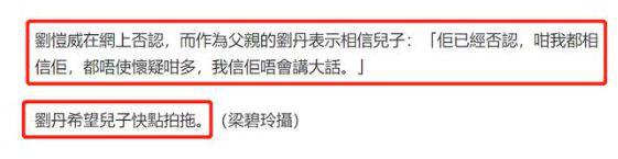 近日刘恺威被拍到与女星牵手散步,但本人并未出面回应,港媒却在面对其父刘丹时直接说刘恺威否认了恋情,刘丹信以为真,则表示既然儿子已经否认了,那么他也是会选择相信儿子不会说谎的。同时刘丹表示自己一直以来也很少会去过问刘恺威的感情事,让他自己去发展,不会过问,但还是会关心儿子的。