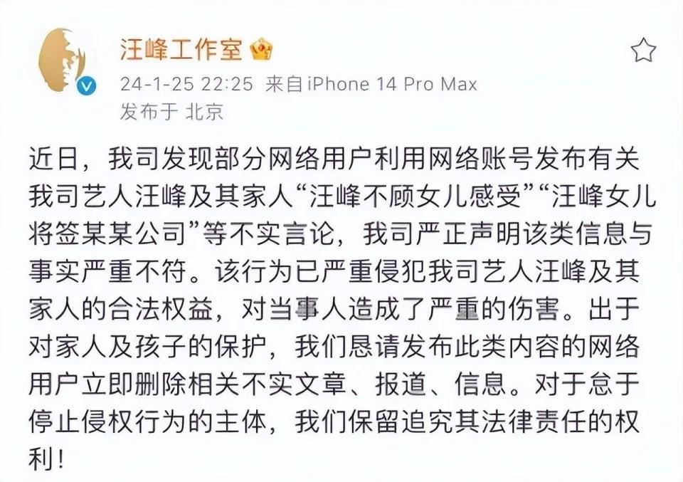 尽管汪峰在事情发酵后以 " 与事实严重不符 " 等说辞否认了,但女儿确实早早出了个人单曲,至于到底什么时间正式出道,也许只是时间问题。