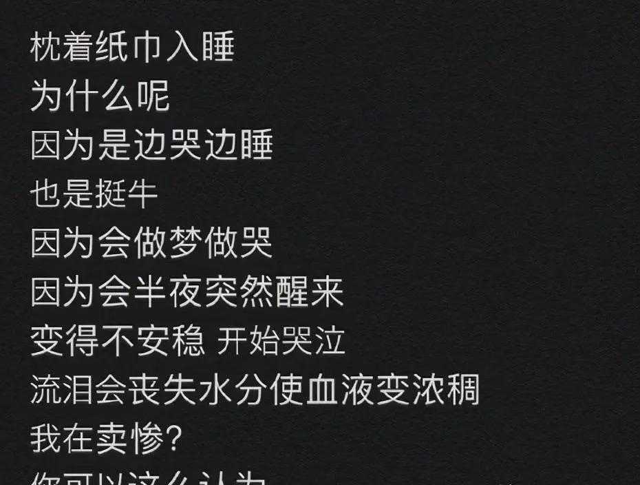 过早见惯了人情冷暖的女孩,在成长过程中得过厌食症、还在未成年的情况下喝酒,曾自曝 " 枕着纸巾入睡、边哭边睡 ",情绪不稳定。