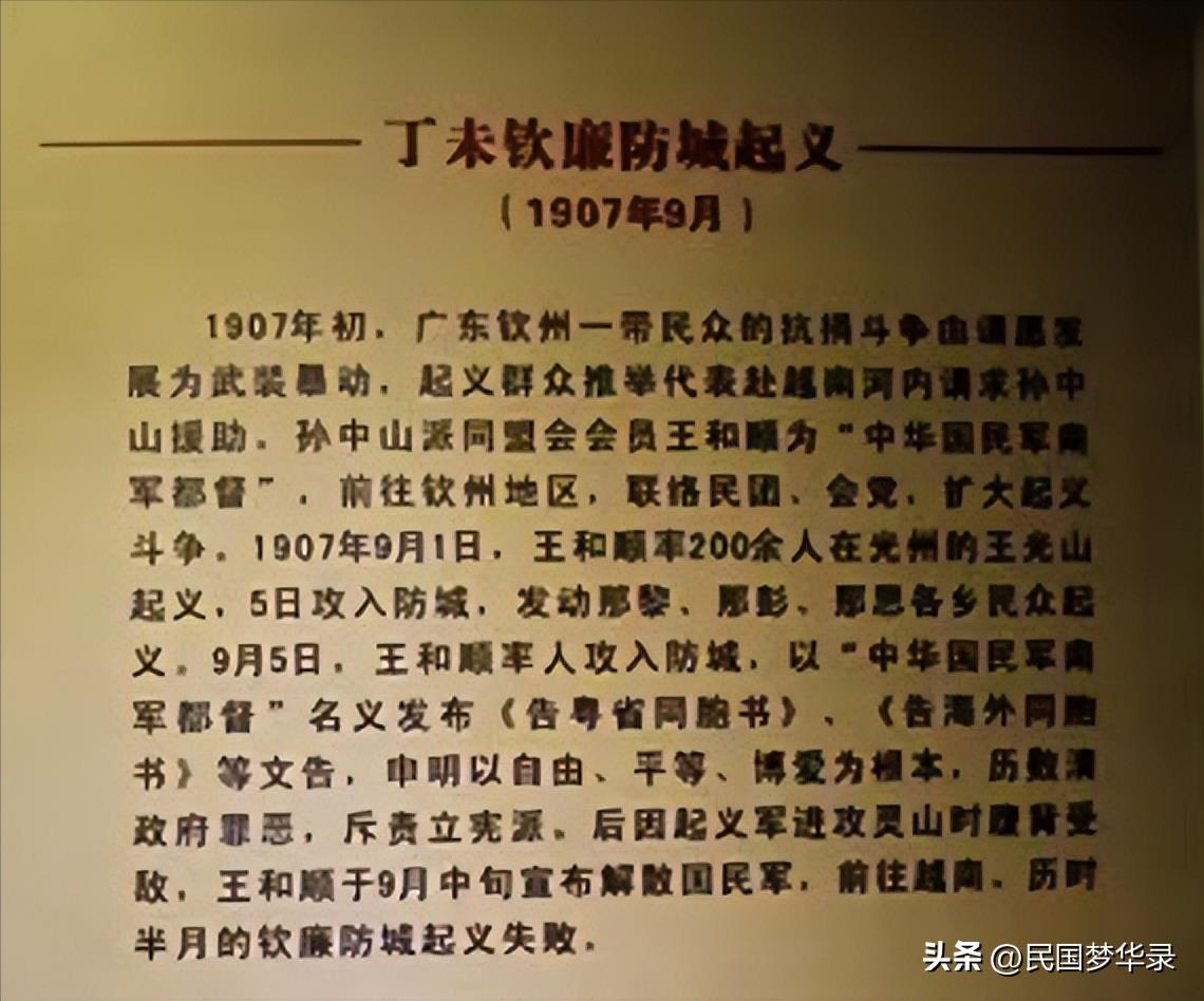 同盟会领导。义军占领广东钦州防城,擒杀知县宋鼎元,民众拍手称快。黄兴亲自潜入钦州策应。义军与清军激战,队伍发展到3000多人。终因弹尽粮绝,队伍解散。