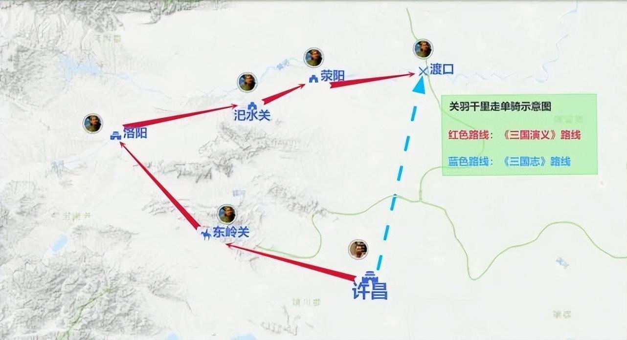过五关,斩六将只是三国演义虚构的,因为关羽的目的是许昌东北方向的袁绍大营,直奔滑州的黄河渡口,过了黄河就是河北,这样的路程是最短的没有必要绕一大圈?