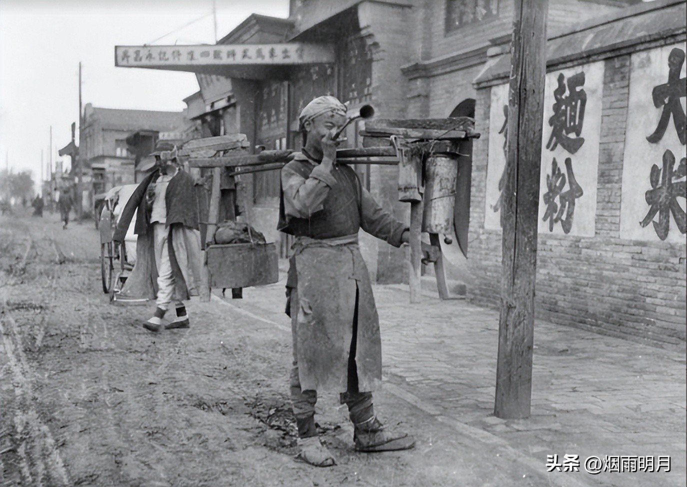 走街串巷的街头小贩,虽然生活很苦,也要苦中作乐,他一边挑着担子,一边叫卖着自己的产品。