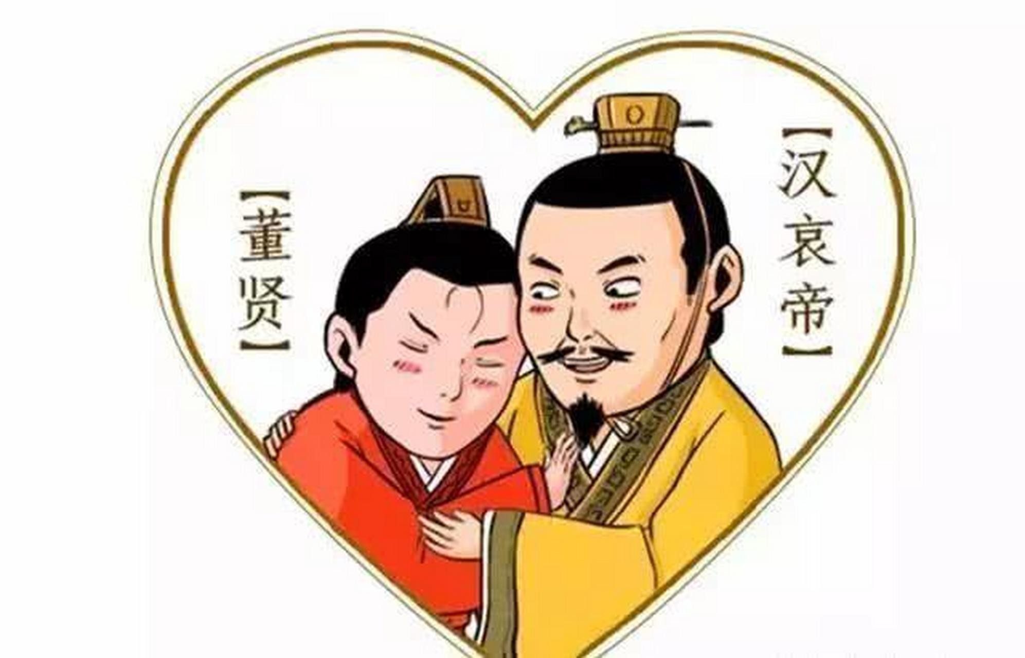 根据《拾遗记》记载,汉哀帝奢靡淫乱,喜男色,臣子都化妆打扮以邀得宠幸。身着女装施以脂粉的董贤成功吸引了汉哀帝的注意,并迅速地位列三公权倾一时。董贤常常与哀帝同卧同坐。曾有一次白天睡觉,董贤头枕住了汉哀帝的衣袖,汉哀帝起床时不想惊动董贤,于是用剑截断衣袖后方才起来。从此,“断袖之癖”也成了同性恋的代名词。董贤最后结局凄惨,哀帝驾崩被罢官后在家中自杀身亡。