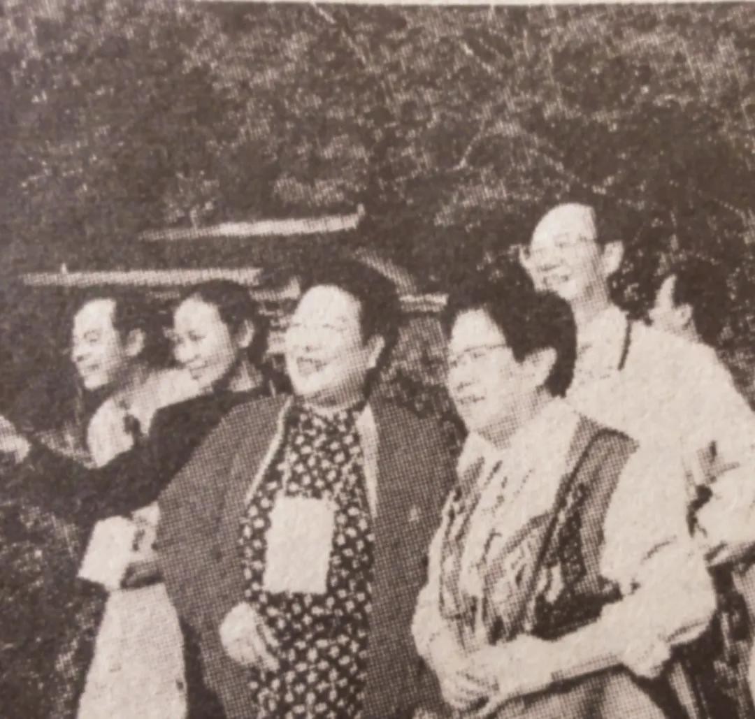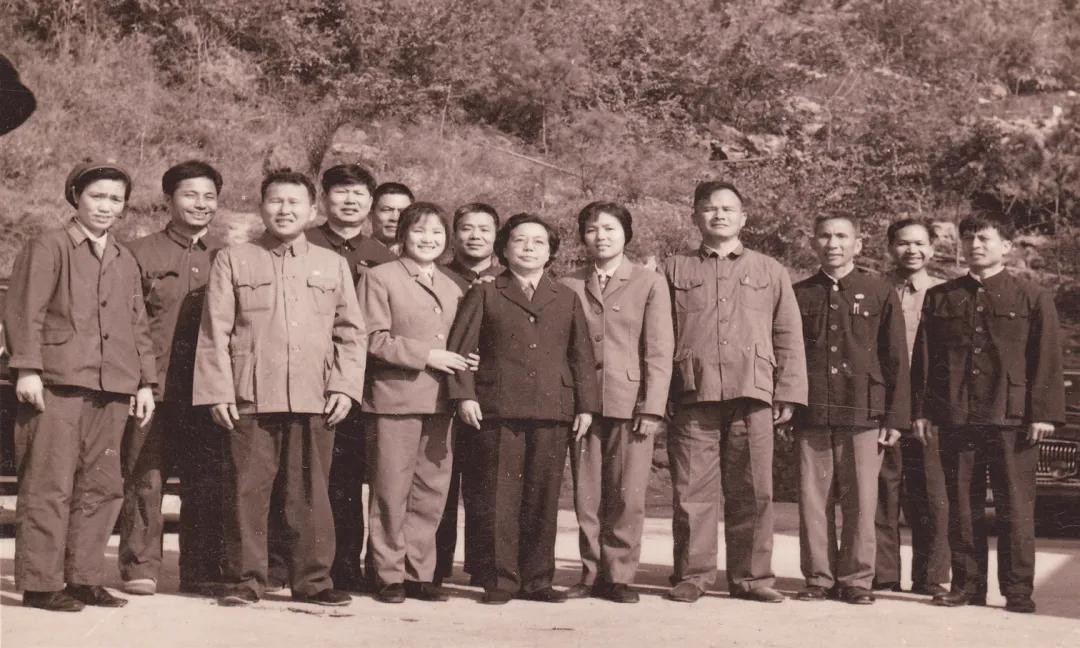 △1978年12月12日,前来广西参加自治区成立20周年庆典活动的中央代表团副团长、中央军委会顾问卓琳(右六)到伊岭岩参观后与接待人员合影留念。/《武鸣百年图籍》