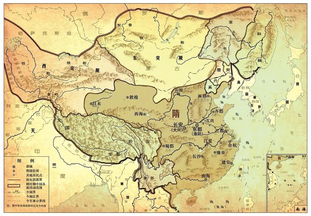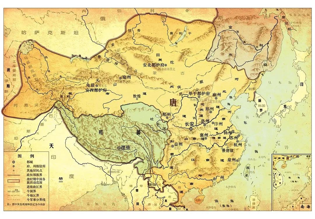 隋唐(581年—907年):隋朝短暂统一,唐朝时期疆域达到了空前规模,包括今天的西藏、新疆以及中亚的部分地区,甚至一度到达西亚。