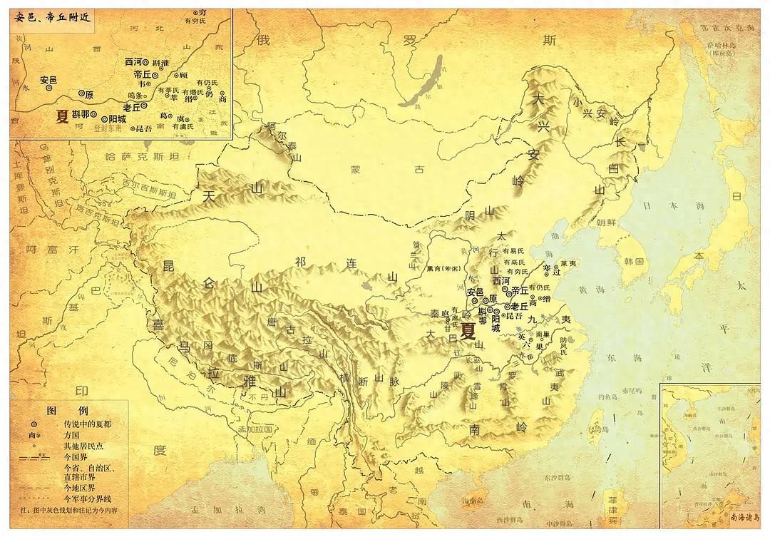 夏朝(约前2070年—约前1600年):夏朝是中国最早的奴隶制国家,其版图大致集中在黄河流域中部,中心区域为中原地区,具体边界尚无确切考古证据。