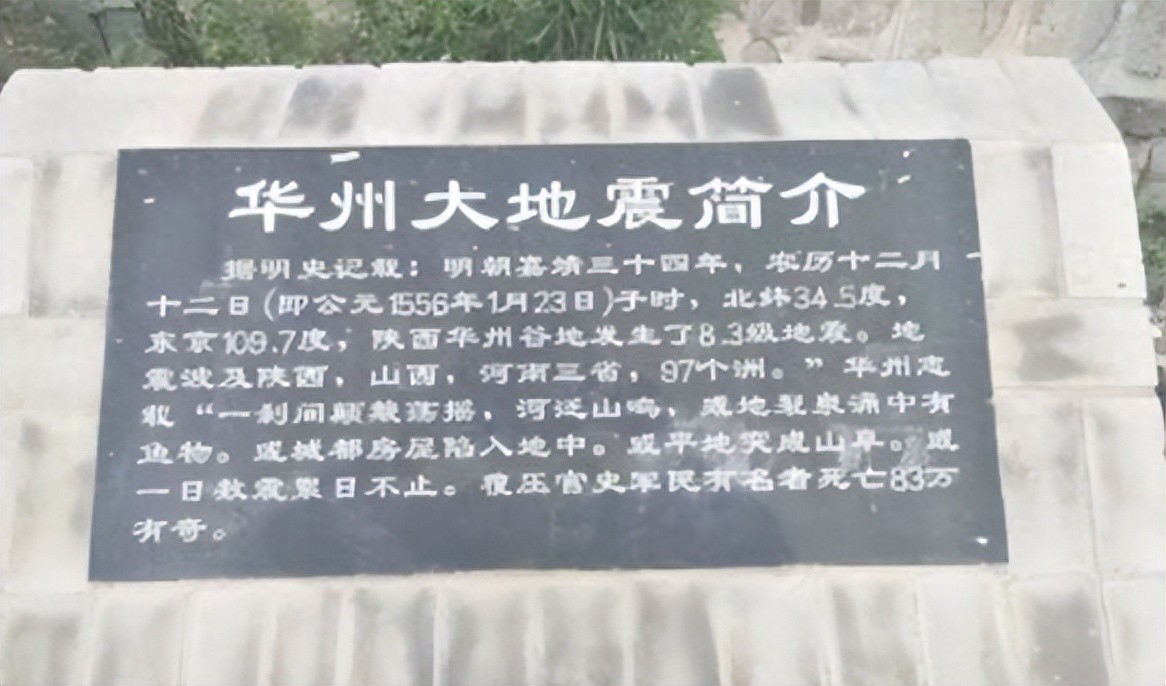 嘉靖大地震,也称华州大地震,是发生于明朝嘉靖三十四年农历十二月十二(公元1556年1月23日)发生的大地震,现代科学家根据历史的记录,推断当时的地震强度为矩震级8.0级至8.5级。这次大地震是中国历史上破坏力最强的一次大地震,也是世界有历史纪录的地震中死亡人数最多的地震,共83万人死亡,死亡人口之多几乎达到当时中国人口的百分之一。