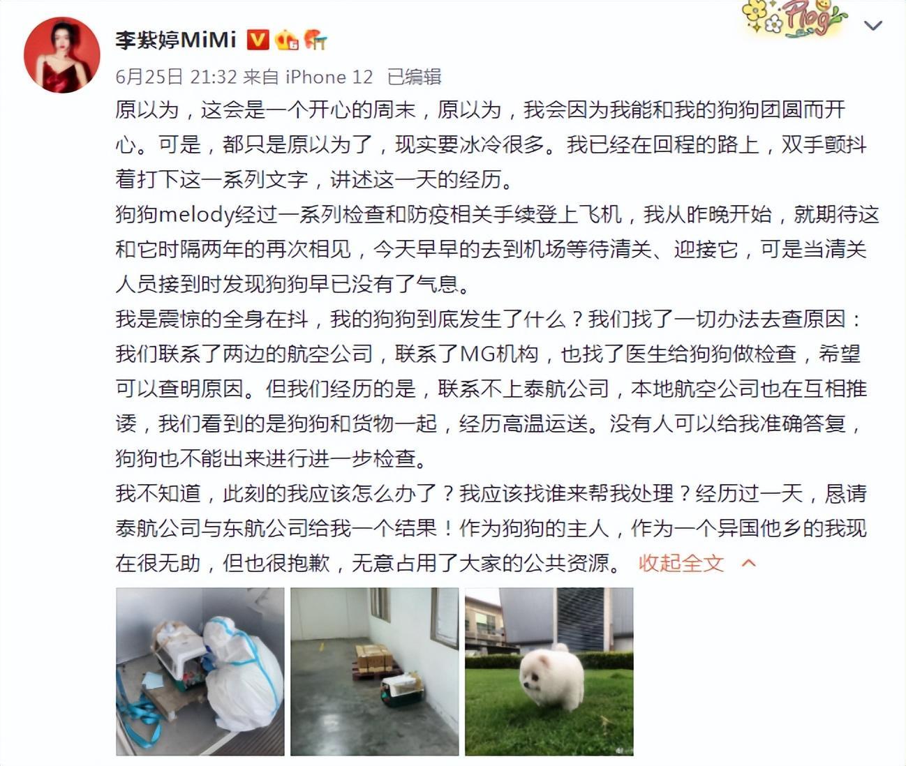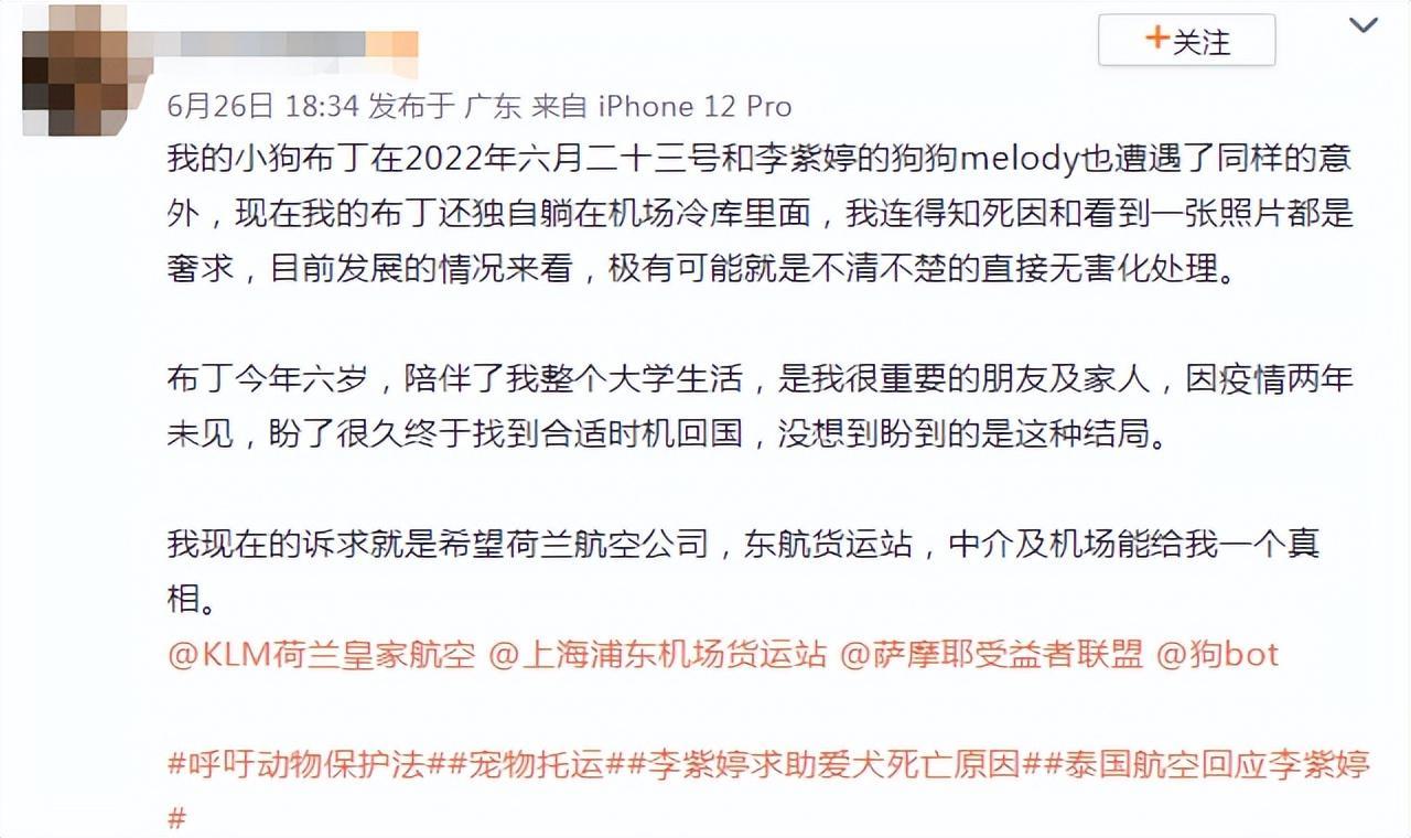 就在李紫婷发微博维权的同时,还有一位既不是明星也不是博主的普通人表示,她的小狗于6月23日和李紫婷的狗狗一样遭遇了意外,目前还独自躺在机场的冷库里。她连得知死因和看到一张照片都是奢求,而且极有可能不清不楚的直接无害化处理。