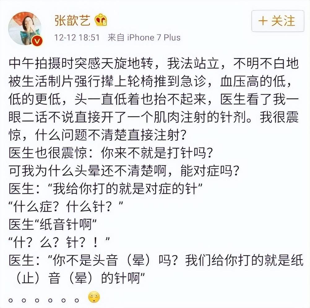 比如张歆艺就曾经在片场突发低血压,头晕眼花被带到医院,医生当场给她开了止晕针,结果张歆艺反手就发微博吐槽,还嘲笑人家的口音。