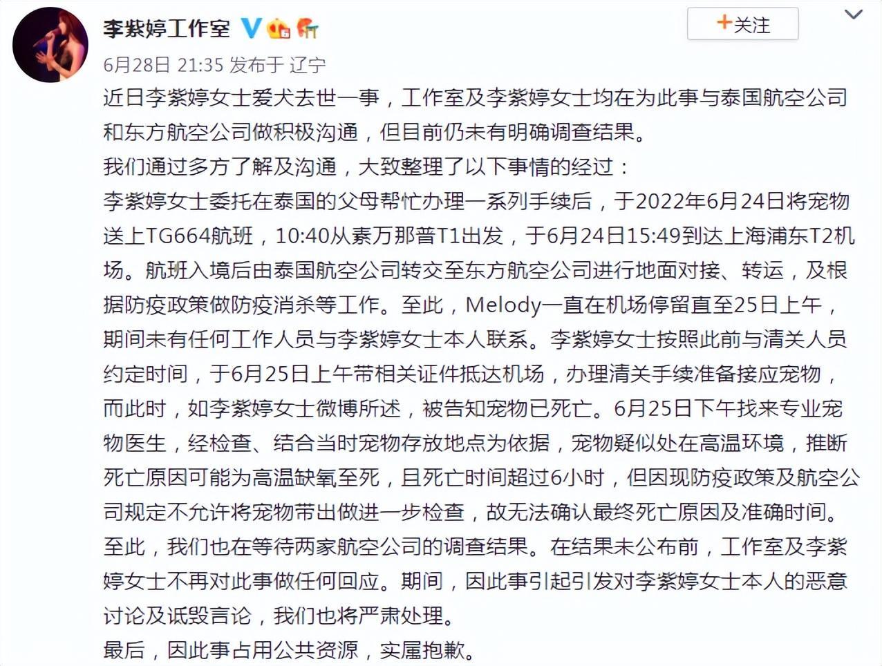 两天之后,也就是28日晚上,李紫婷工作室再次发布微博长文,表示他们在事发之后一直有跟泰航、东航进行积极沟通,但目前仍然没有明确的调查结果。