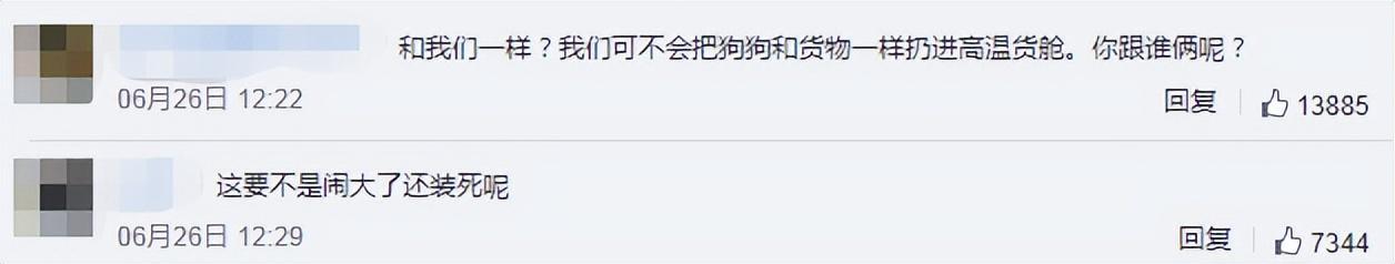 还有一些人选择开麦嘲讽,“你跟谁俩呢”、“我们可不会把狗狗扔进高温货舱”、“暴力运输可看不出来你们珍爱小生命”,甚至有人对这件事做出了一句话的高赞总结:这要不是闹大了,估计还装死呢。