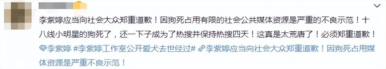 “18线明星死个狗值得都上热搜”、“明星就是好,养条狗都能上热搜”、“热搜这么宝贵的资源,是不是应该让给更需要的人”、“狗死了就占用有限的公共媒体资源,这是不良示范,她应该道歉”、“明星真好可以用微博维权,普通人就没这么多人关注”…