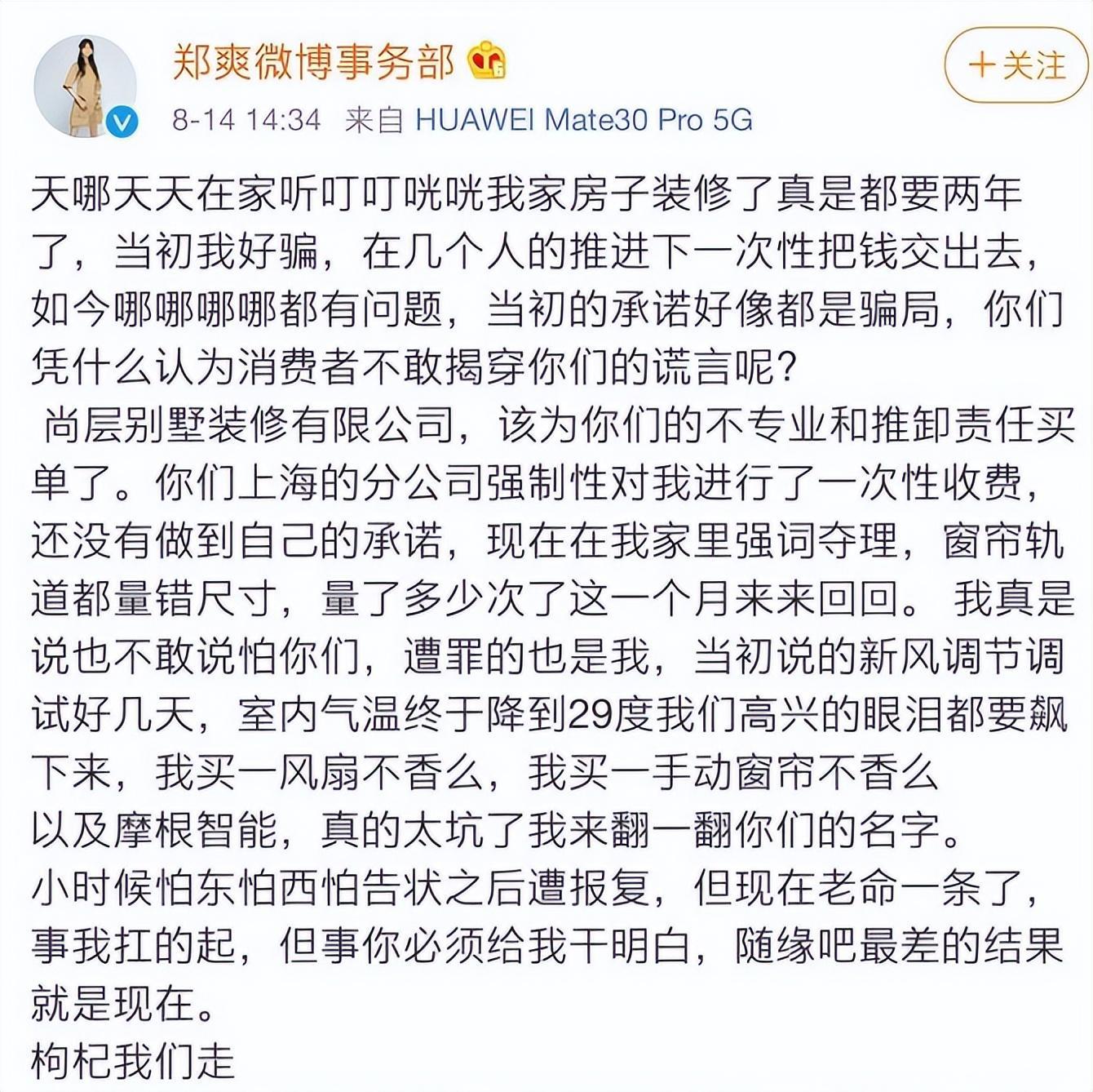 又比如爽子还活跃的时候,曾经用工作室账号发文控诉过装修公司,说她自己太好骗,一次性付清了所有钱,然后这都两年了还没装修完。爽的粉丝当然是火速冲向那家装修公司,催他们要么赶紧装完要么赶紧退钱,总之不能让他家正主吃这亏。