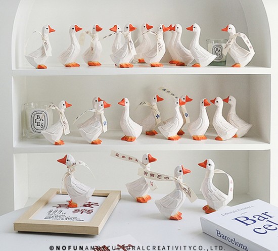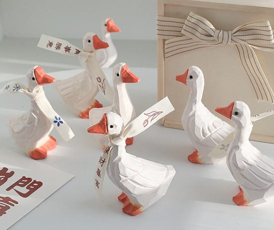 鸭子大概是有10cm高,材质是石膏,外面的涂色是人工喷涂,因为是雕刻工艺,所以每只会有些许不同哈~