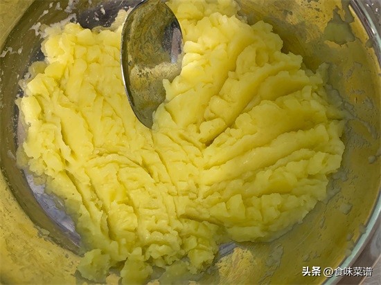 2、把蒸好的土豆片,倒入盆中,用勺子轻轻碾压,捣成细腻的土豆泥,另外准备一个碗,碗底抹一层油,装入土豆丝,抹油是为了方便脱模。