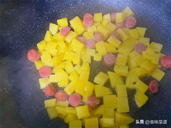 2、起锅烧油,油热先倒入土豆,用中小火慢慢煎一煎,煎至变色以后,再倒入香肠,一起翻炒一下,一直炒至变色焦黄。
