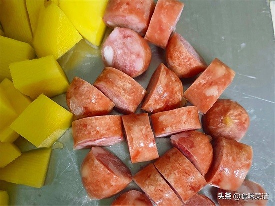 1、准备两个土豆,刮掉外皮,清洗干净,改刀切成四方块,起锅烧水,放入土豆煮3分钟左右,捞出控干水分,另外再切一些香肠。