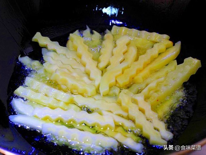 3、起锅烧油,油不用倒太多,油温六成热的时候,倒入土豆炸一炸,喜欢脆的就少炸一会儿,喜欢软绵口感的就多炸一会儿。