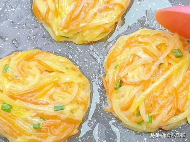 3、起锅烧油,油热舀入土豆丝面糊,为了面馆,尽量整理成圆形,用中小火加热,煎至定型后,再翻动另外一面,中间多翻动几次,保持受热均匀。