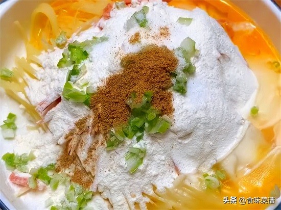 1、碗中加入土豆丝、胡萝卜丝,适量的面粉,打入2个鸡蛋,调味放十三香、食盐和葱花,试着搅拌一下,如果过于干燥,再少来一点水分,把黏稠度调好。