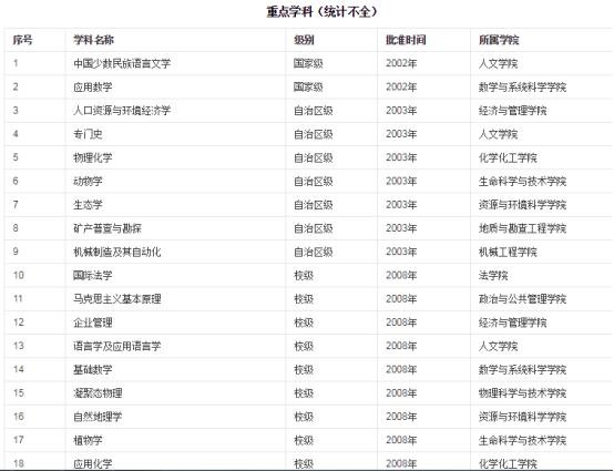 据2025年7月学校官网显示,有2个国家级重点学科,1个国家重点培育学科;6个自治区高峰学科、7个自治区高原学科,2个学科(化学学科、工程学科)进入ESI全球前1%;有14个博士学位授权一级学科、涵盖78个博士二级学科点,33个硕士学位授权一级学科、涵盖161个硕士二级学科点,11个博士后科研流动站,18个硕士专业学位类别。