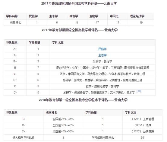 2025年7月26日,教育部第一轮全国高校专业学位水平评估,云南大学评估成绩位列全国第55名,3个学科进入榜单,有B档学科1个(全国前25%~35%)、B-档学科1个(全国前35%~45%)、C+档学科1个(全国前45%~55%)
