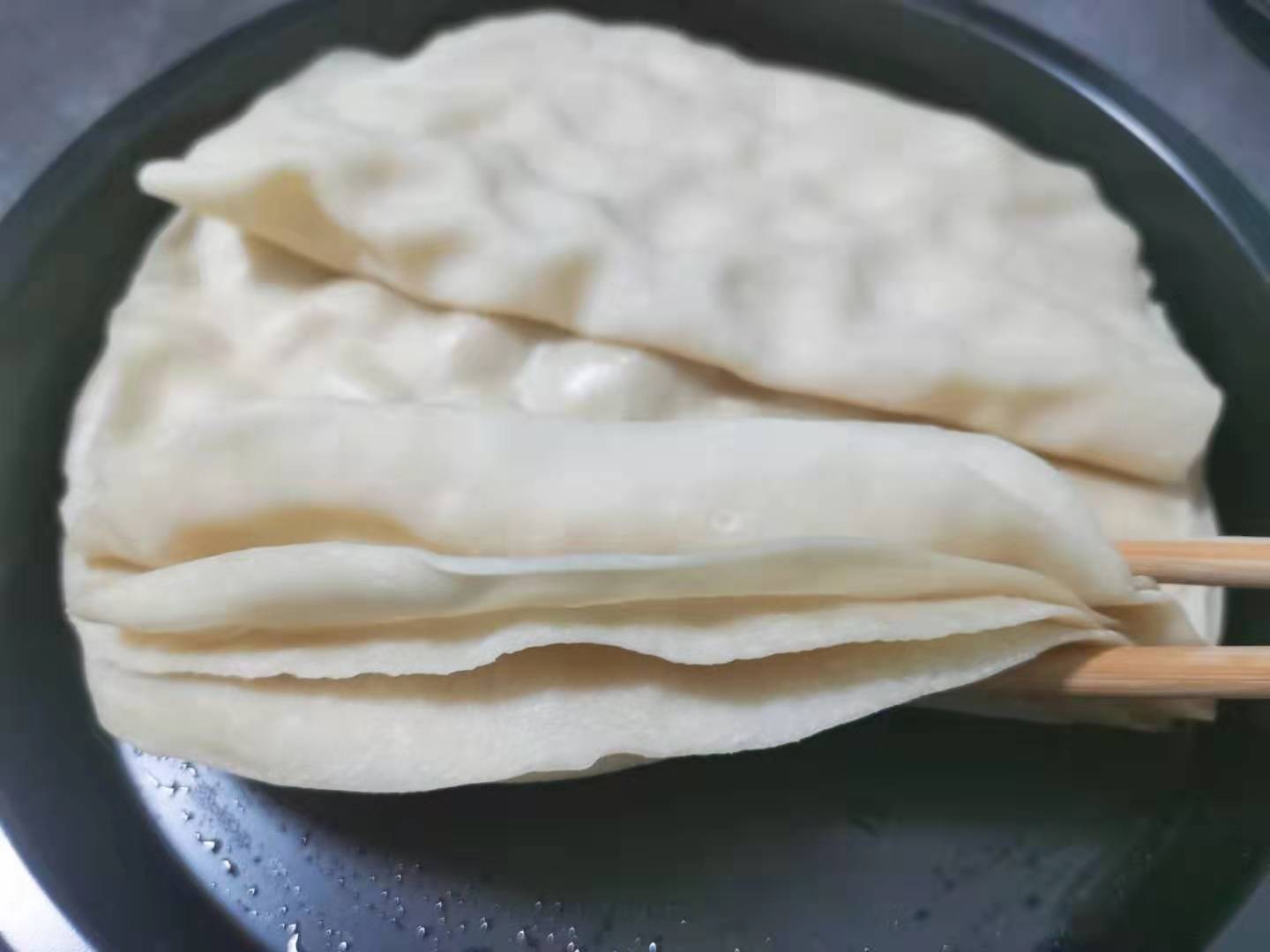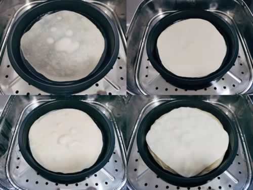 ②再次蒸制3-5分钟左右就可以取出了,这样做出的春饼又薄又软,不用刷油也不会粘在一起。