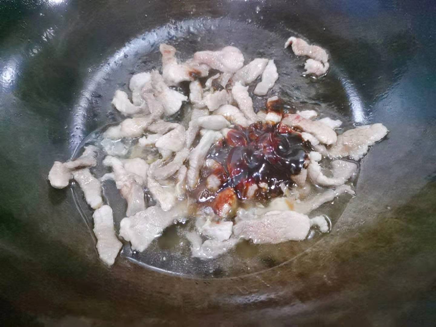 2、锅中倒入适量油,油热后倒入肉丝,翻炒至变色后加入10克甜面酱和3克食盐翻拌均匀。