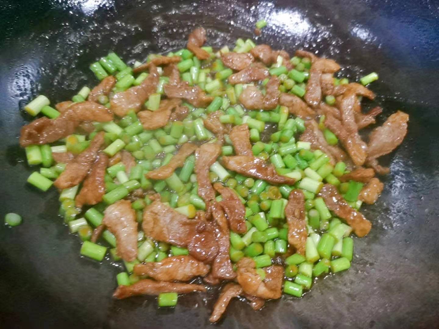 3、加入切好的蒜苔,翻炒片刻即可出锅,将炒好的配菜加些葱丝卷进春饼中,就可以开吃啦!