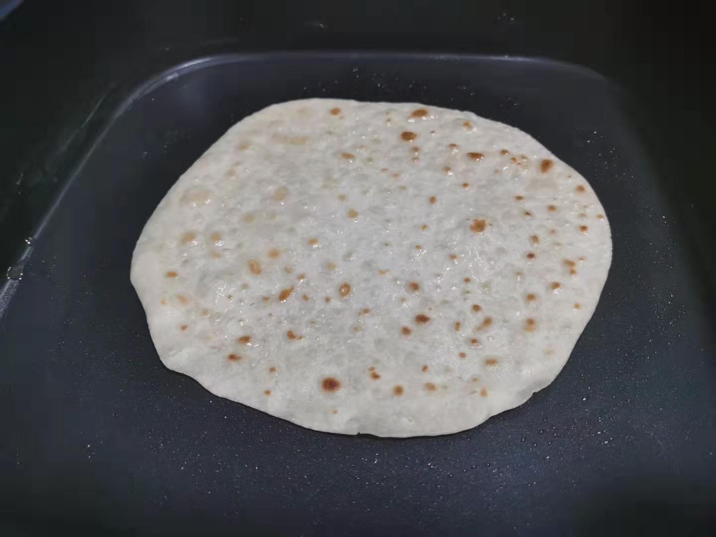 ②烙制一面鼓泡且饼皮变色后,翻面继续烙制,两面均变色且饼皮鼓包时即可关火盛出。烙制的春饼比蒸制的春饼吃起来更加筋道一些。