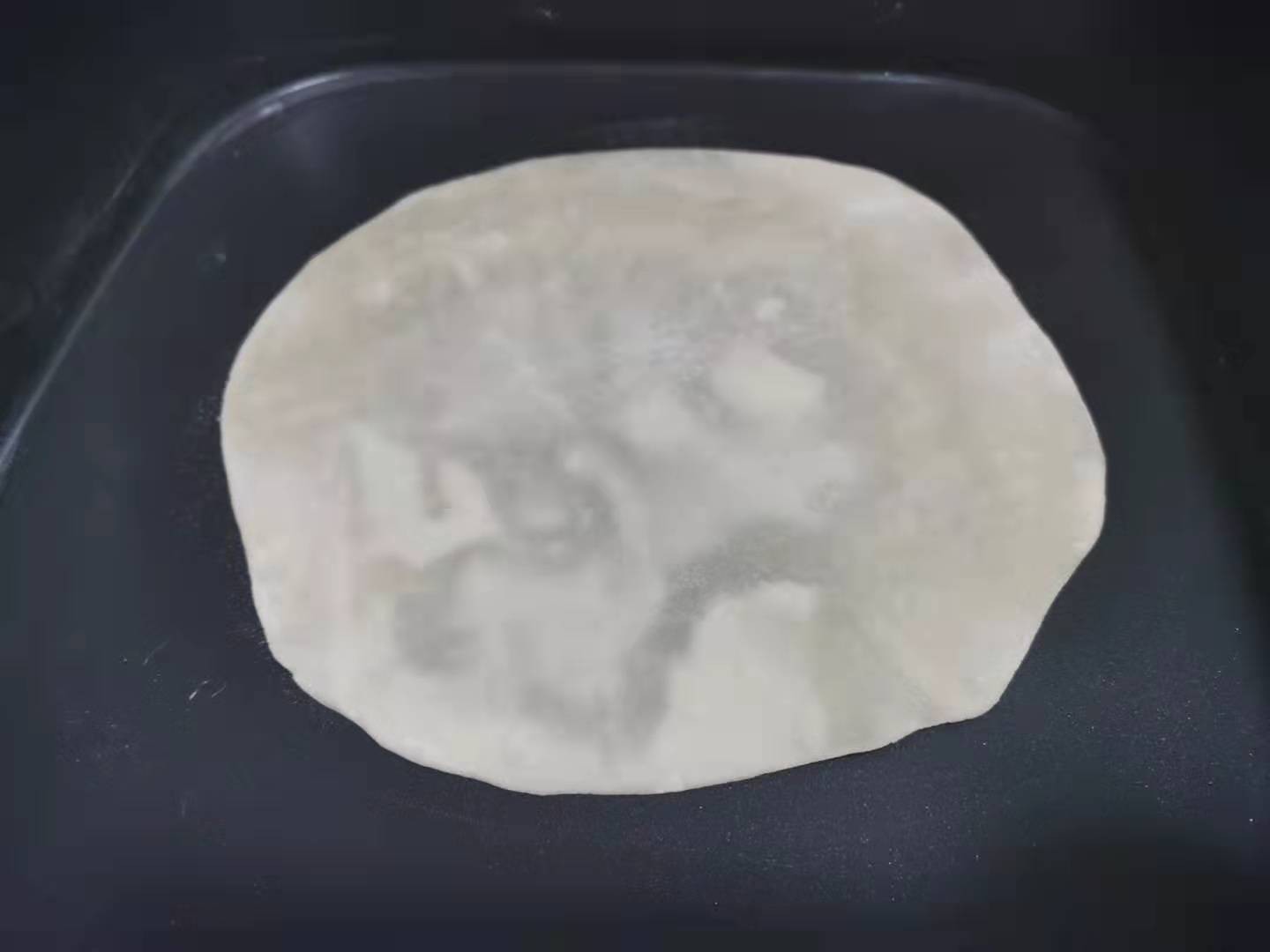 ①将擀好的饼皮放入不粘锅或电饼铛中小火慢烙,一般烙制的春饼是不用放油的,不过你如果喜欢香香的油酥的口感,也可以加入适量食用油。