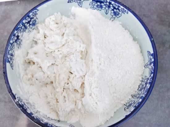 2、另一半面粉用冷水搅拌成散面团,然后用手将两种面团揉搓到一起,直到光滑即可。