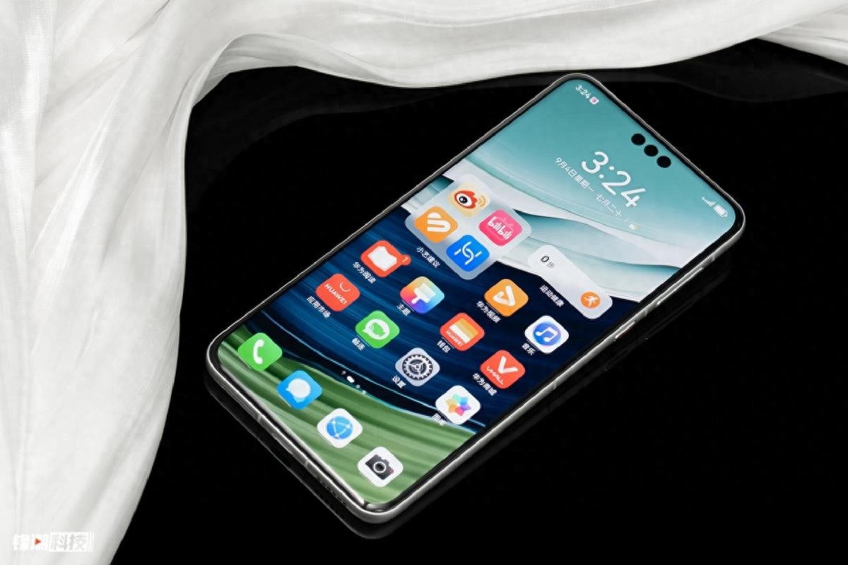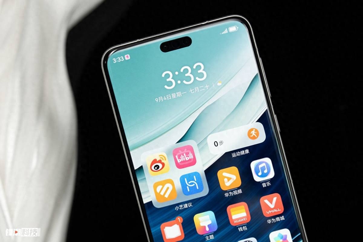 再翻到正面,就看得到这次华为 Mate 系列首次用上的等深四曲屏,曲面的部分其实占比非常小,让这块屏幕有了一种久违的悬浮感,同时边框也做到了四边近似的水准,尽管顶部有三枚前置摄像头的开孔,但整体还是比较和谐的。