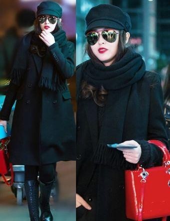 4.主色黑,配色亮色包包,帽子来配,重点突出黑色,一点撞色点睛