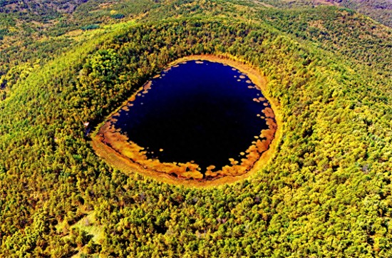 阿尔山国家森林公园内的天池以超高“颜值”成为阿尔山旅游的地标景点,图为心形天池在秋色的映衬下格外耀眼。中国旅游报记者 陈晨 摄