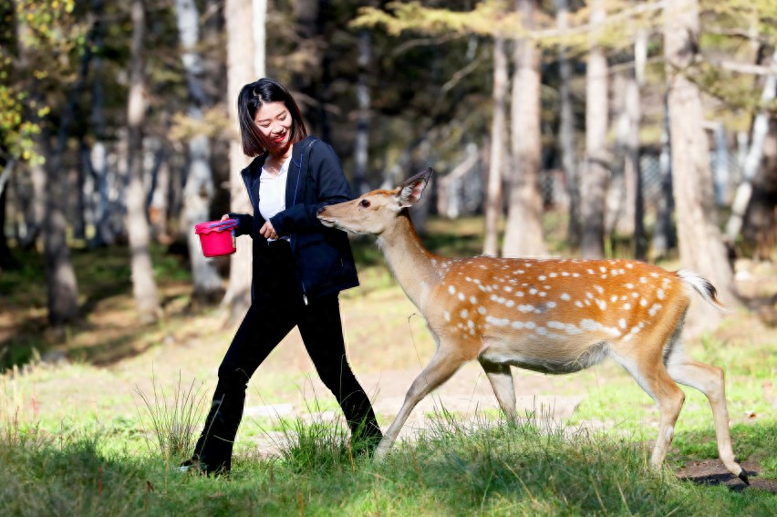 在阿尔山市白狼镇鹿村,游客与小鹿亲密互动。中国旅游报记者 陈晨 摄