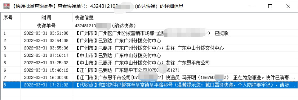 等全部查询完毕,就可以看到每个单号的物流情况,像