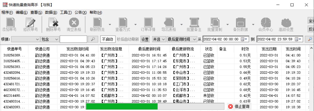 保存好了,进度条滚动,开始查询所有快递单号物流,