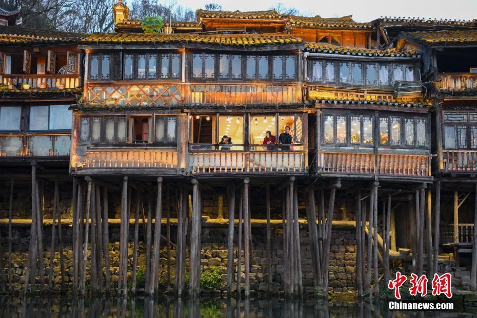 图为2月12日,凤凰古城吊脚楼上的游客正在欣赏美景。中新社记者 杨华峰 摄