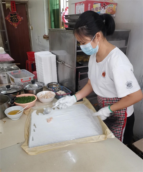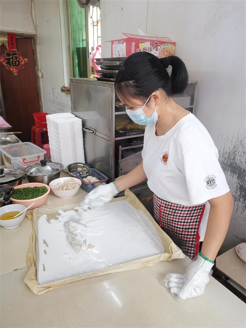 8、把肠粉从布上刮下来成卷状。