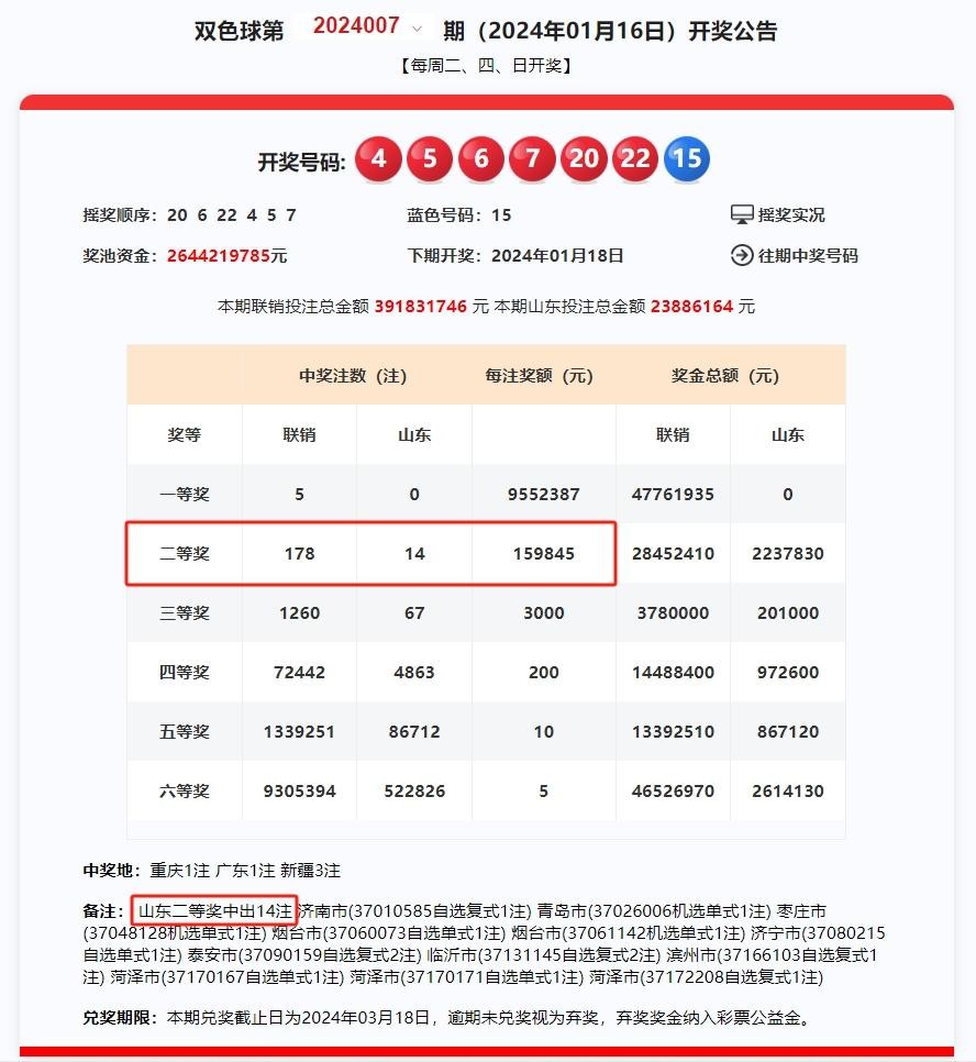 瑞雪也带来了大奖的好消息,1月16日晚双色球第2024007期开奖,全国一等奖中出5注单注奖金955万元,二等奖中出178注单注奖金15.9万余元,山东彩友喜获14注二等奖,一起看看本期开奖情况吧。