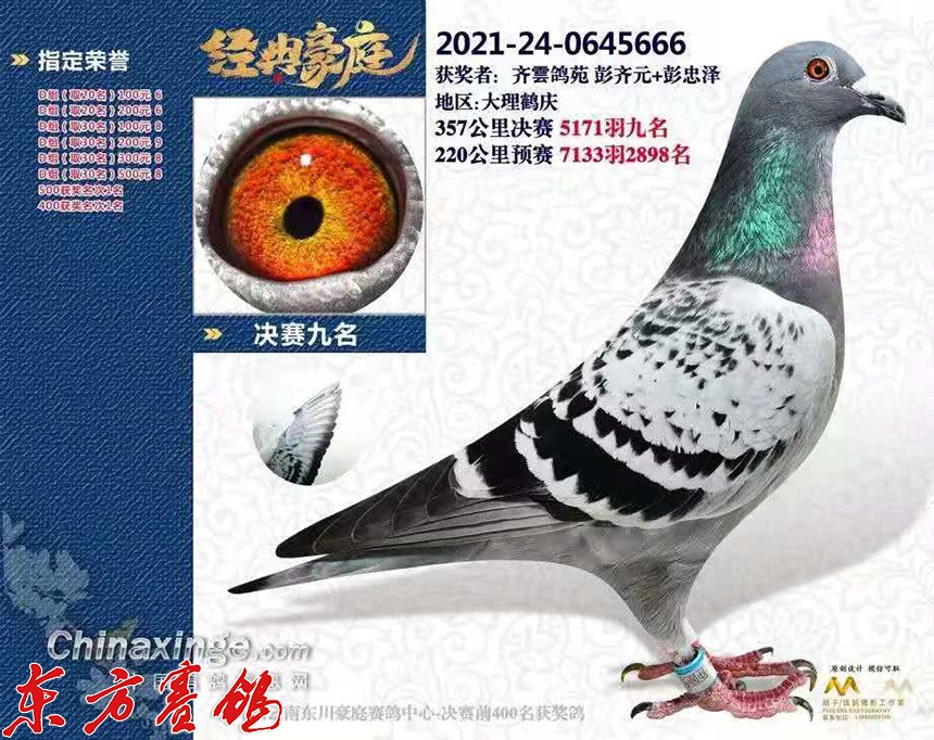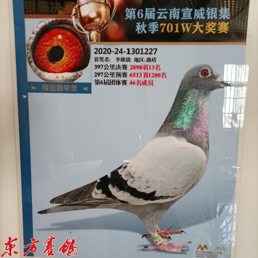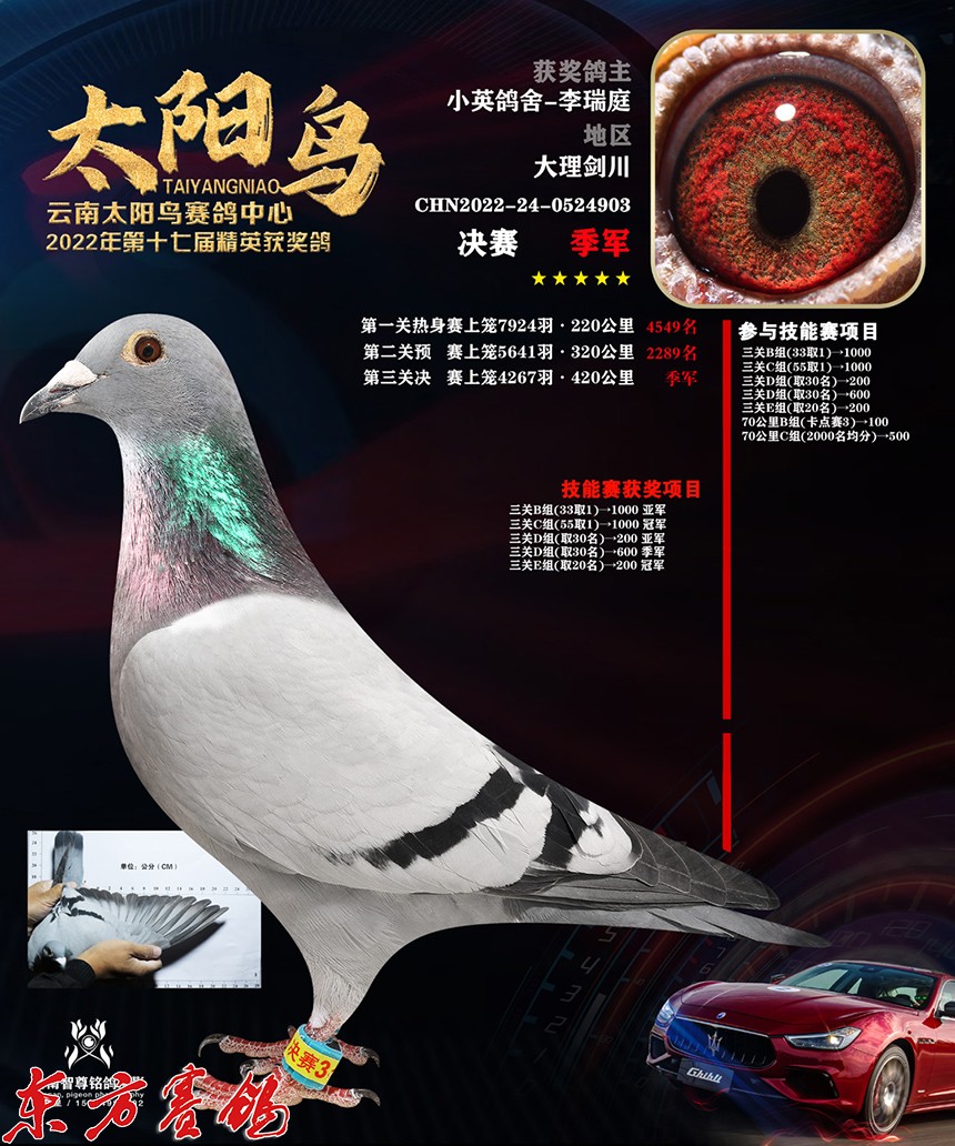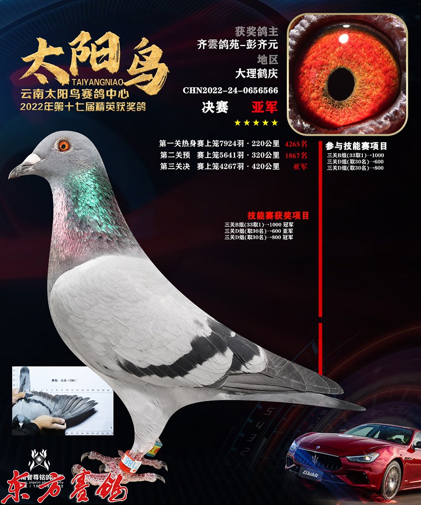 获得亚军鸽为母鸽,血统为速霸龙胡本X林波尔,环号2022-24-0656566灰于11月23日12:12:53.906归巢,分速为1631.4537米/分,决赛上笼6羽,归巢四羽,其中二羽入赏2羽迟归,名次为2、877。获得奖金50多万元。