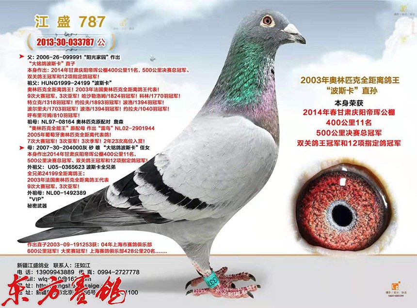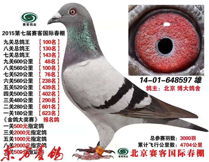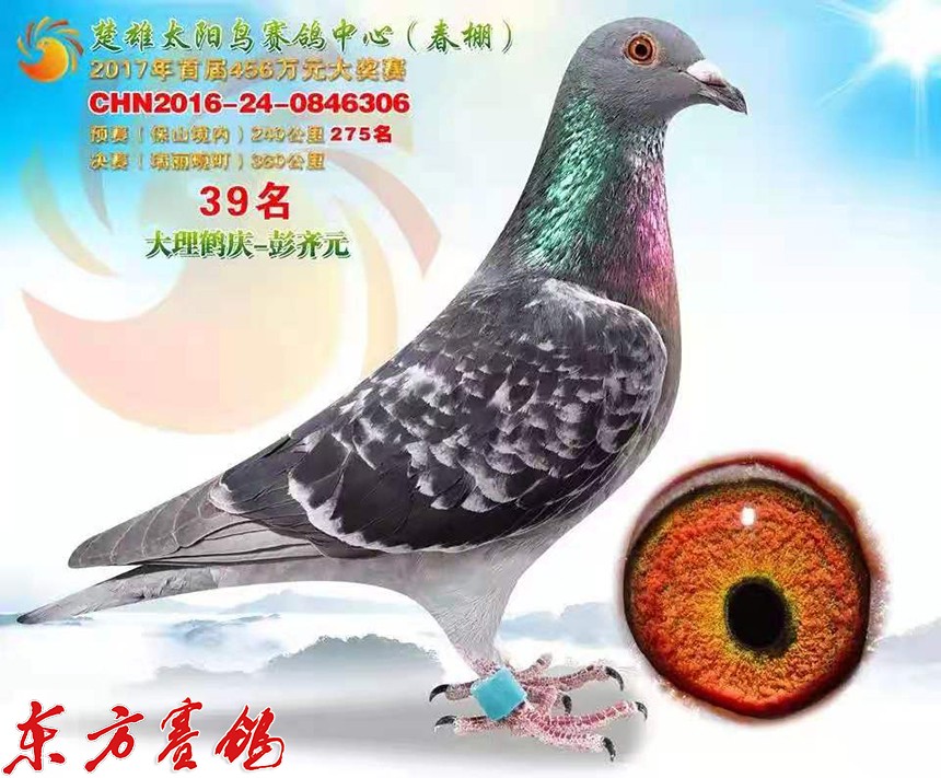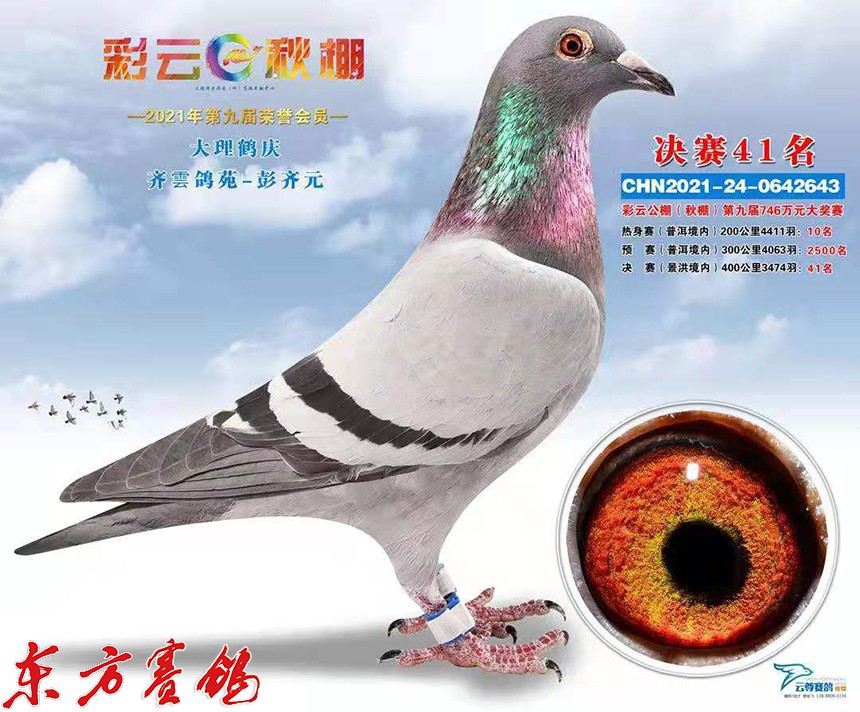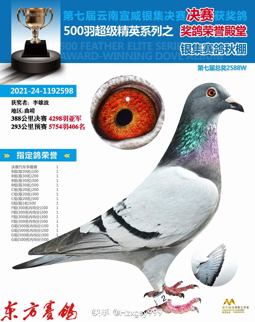 获得亚军鸽为母鸽,血统为速霸龙胡本X林波尔,环号2022-24-0656566灰于11月23日12:12:53.906归巢,分速为1631.4537米/分,决赛上笼6羽,归巢四羽,其中二羽入赏2羽迟归,名次为2、877。获得奖金50多万元。