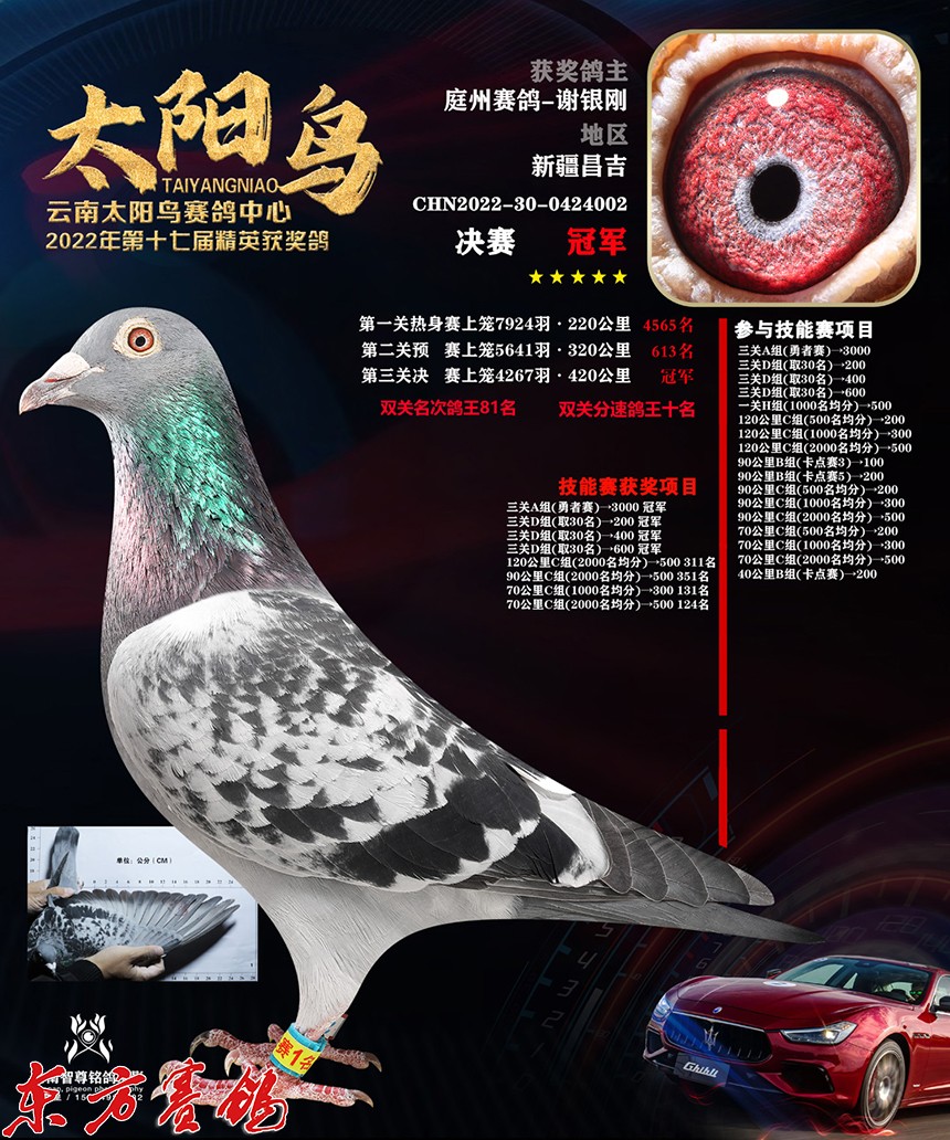 他这羽环号2022-30-0424002雨点,以1631.9798米的分速第一个报到,除获得了冠军50万大奖外,同时荣获汽车大奖赛马莎拉蒂豪车,还获得挑战赛20余万元,累计获奖金170多万元,成为今年太阳鸟公棚最大的赢家。