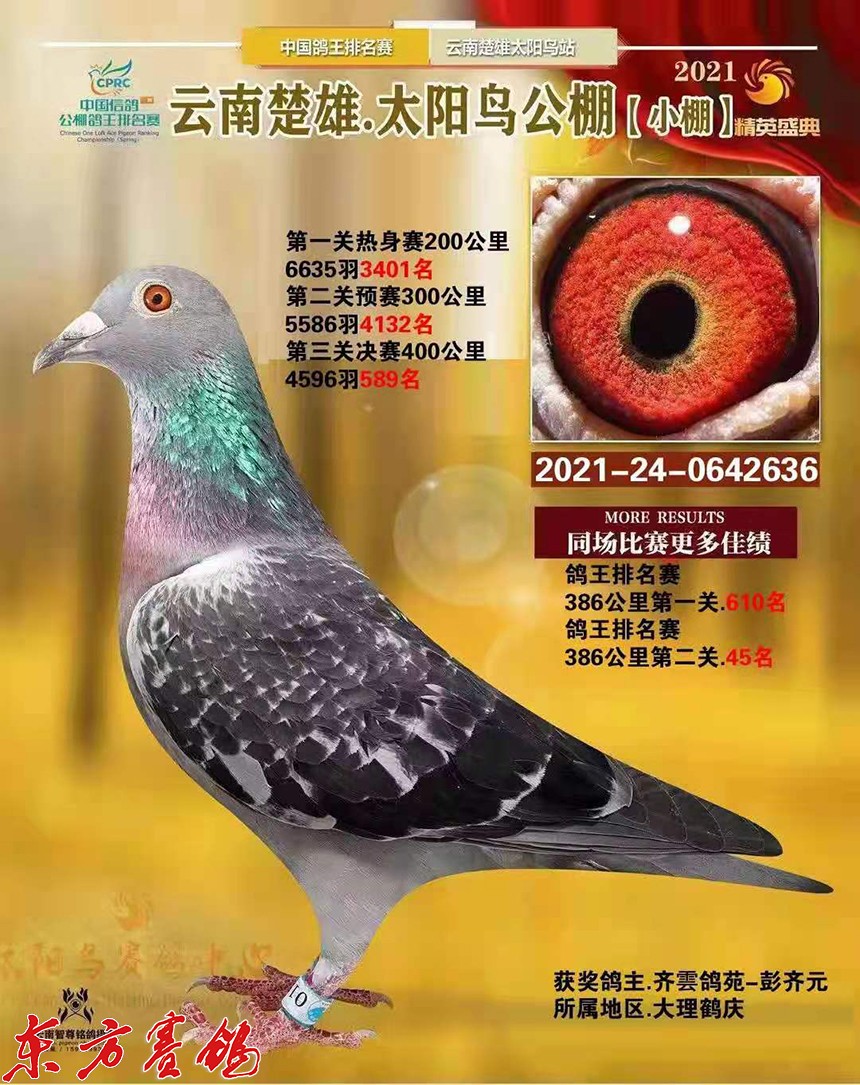 2020年云南大理巍山龙翔公棚彩鸽组亚军,汽车赛亚军;云南大理天都公棚决赛18名;云南大理剑川福锦源公棚决赛大团体亚军。