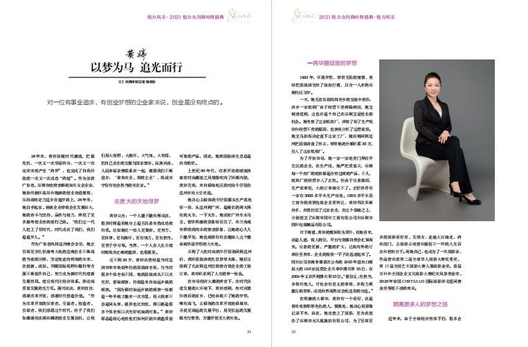 “进入新发展阶段,踏上又一个百年新征程,作为新时代的企业家,时代要求我们,不仅要有能力在顺境中成大事,更要有定力在逆境中大成长。”黄婷一直这样勉励自己,也引领更多的创业者一起奔跑在追梦途中。