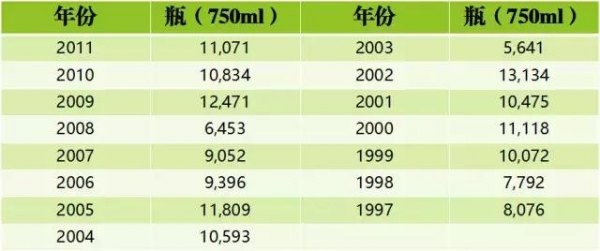 2011 年:5,523 瓶2010 年:8,480 瓶2009 年:5,219 瓶