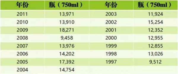 由上表可以看出,罗曼尼-康帝园葡萄酒的年平均产量约为 5,300 瓶。其产量非常稀少,还不及拉菲古堡(Chateau Lafite Rothschild)产量的 1/50。所以说,罗曼尼-康帝园葡萄酒比拉菲古堡贵上十几倍,也不是没有理由的。