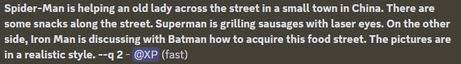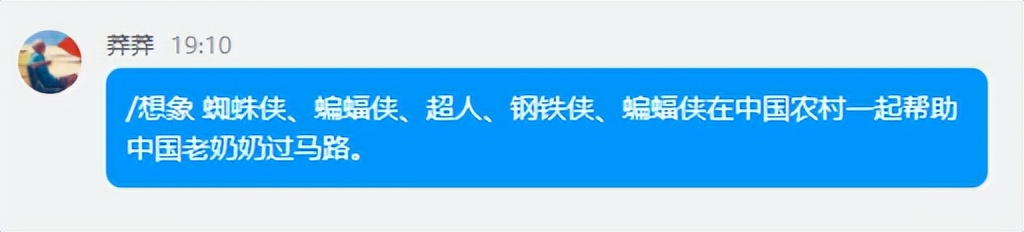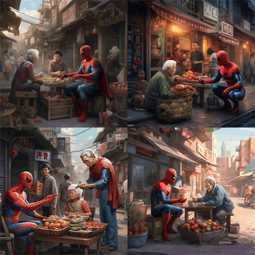 我先是去了英文版的 Midjourney ,让它以写实风格画一个蜘蛛侠在中国小镇扶老奶奶过街,超人在用激光眼烤火腿肠,钢铁侠和蝙蝠侠在一边讨论收购这条美食街的图片。