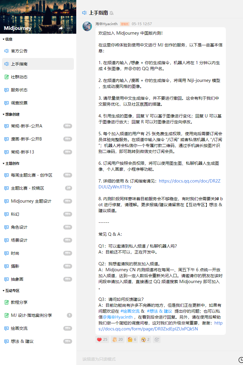 说是每周一和周五下午6点会统一开放入口,在 QQ 频道搜索 Midjourney 加入频道,就能上手试用这个 AI 神器。